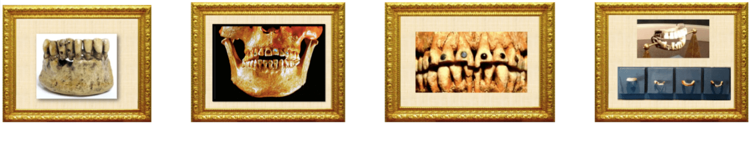 Esquerda: Prótese em formato de ponte, utilizando dentes humanos como elementos proféticos, amarrados aos remanescentes com fios de ouro. Itália - Etruscos cerca de 500 aC.